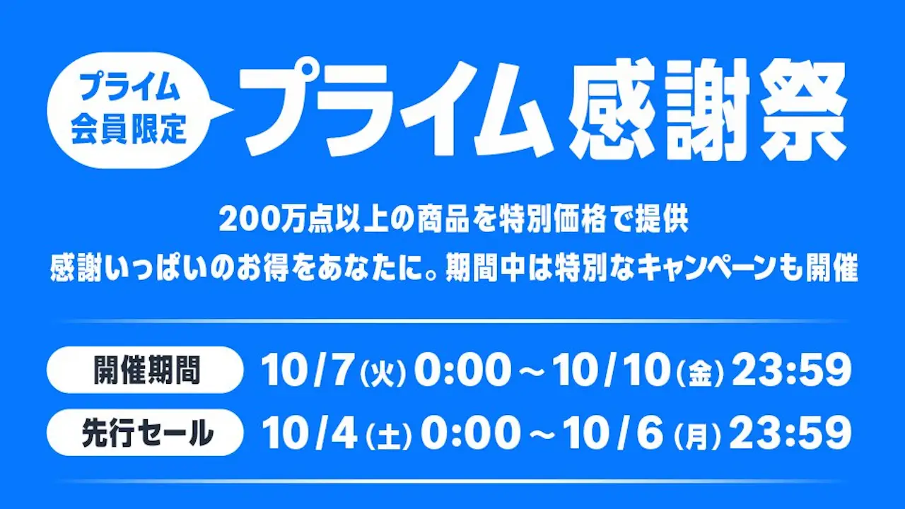 Amazon.co.jp(アマゾン)は、2025年10月4日から6日までのセール「プライム感謝祭先行セール」を開始しました。