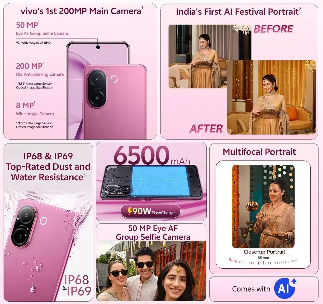 vivo V60eは、Dimensity 7360-Turboを搭載した5G対応スマートフォンです。6.77インチAMOLED 120HzディスプレイやOIS対応の2億画素カメラ、90W急速充電対応の6500mAhバッテリー、防水防塵(IP68/IP69)対応。インドで発売、価格は29,999INR(約5.2万円)から。