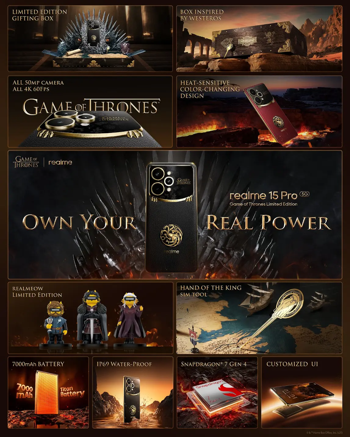 realme 15 Pro 5G Game of Thrones Limited Editionが海外で限定5000台発売。HBOドラマ「ゲーム・オブ・スローンズ」がコラボした特別モデル。タイでの価格は19,999バーツ(約9.4万円)。