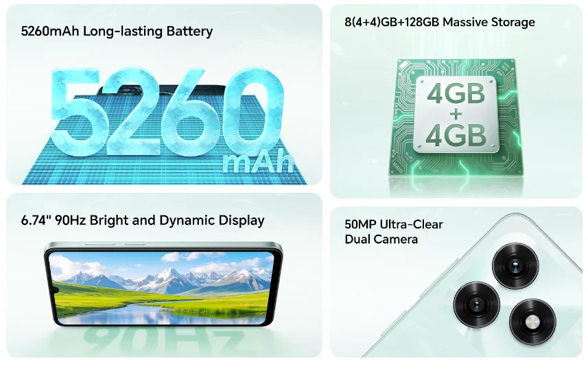 HONOR X5c Plus は、6.74インチHD+(1600×720)ディスプレイ、CPUはMediaTek Helio G81 2.0GHz オクタコア、RAM4GB、ストレージ容量は128GB、カメラは5000万画素+8万画素デュアルカメラのエントリークラスのアンドロイドスマートフォンとなっています。