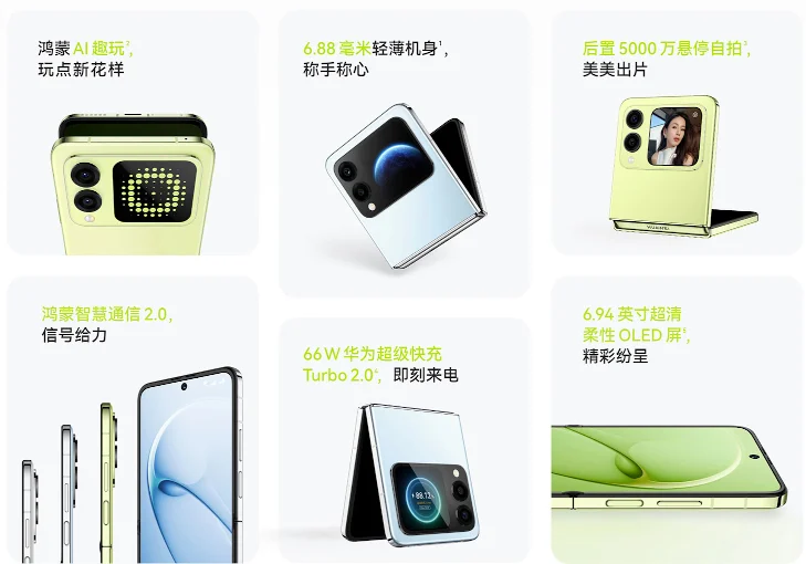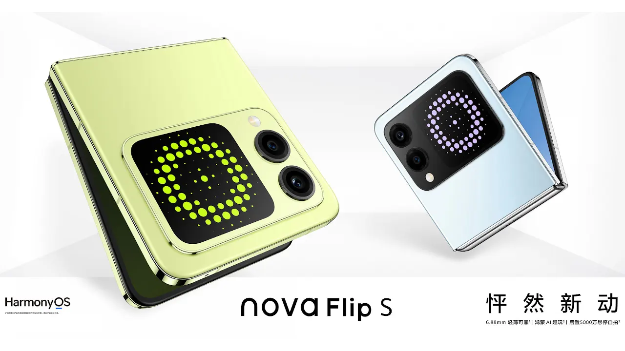 HUAWEI nova Flip SはHarmonyOS 5.1搭載の縦折りスマホ。6.94型OLEDと2.14型サブ画面、66W充電対応4400mAhバッテリー搭載。中国で発売、価格は3488CNY(約7.4万円)。