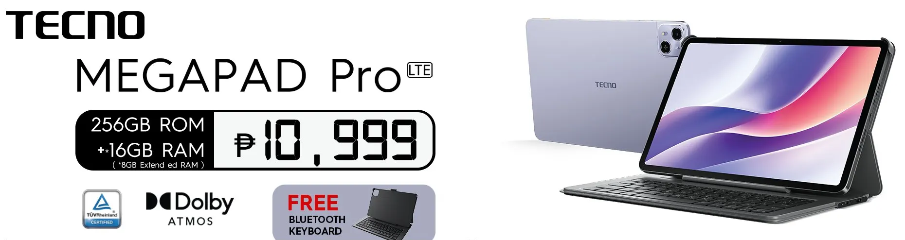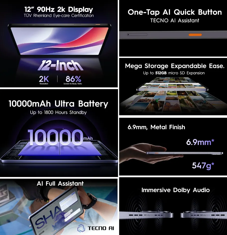 TECNO MEGAPAD Proは、12インチ2KディスプレイとHelio G100 Ultimate搭載のAndroidタブレット。33W急速充電対応10000mAhバッテリーやDolby Atmosクアッドスピーカー。海外で発売、フィリピンでの価格は10,999PHP(約2.9万円)。