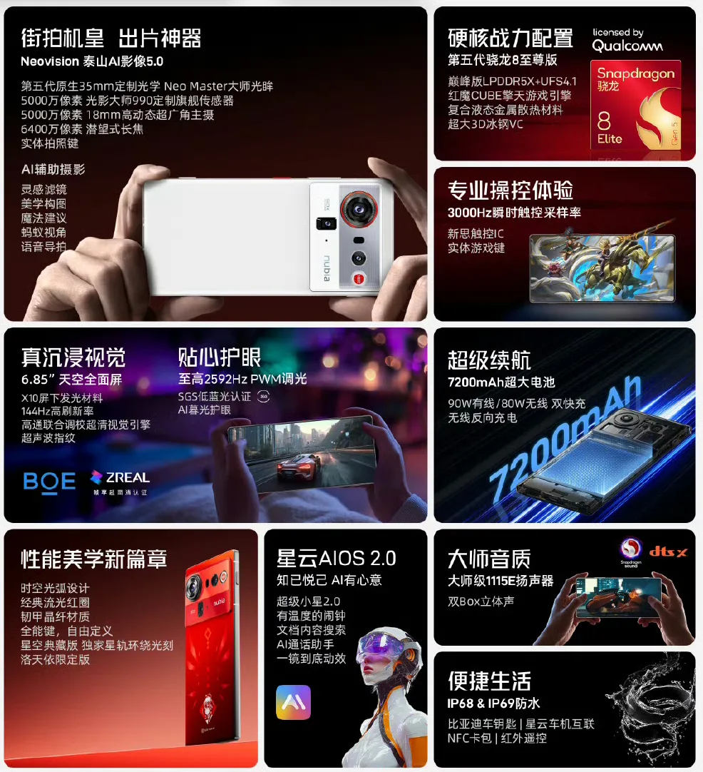 nubia Z80 Ultraは、Snapdragon 8 Elite Gen 5搭載のカメラ特化スマホ。アンダーディスプレイカメラや大型センサー採用35ミリレンズを含むのOIS付き3眼カメラ、7200mAhバッテリーを、防水防塵(IP68/IP69)にも対応。中国で発売、価格は4999元(約10.7万円)から