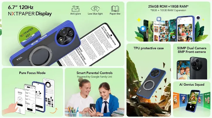 TCL NXTPAPER 5G Juniorは、Dimensity 6300搭載のジュニア向け5Gスマホ。目に優しいNXTPAPERディスプレイやペアレンタルコントロール対応で、5200mAhバッテリーやIP54防水防塵。ヨーロッパで発売、価格は249ユーロ(約4.4万円)。