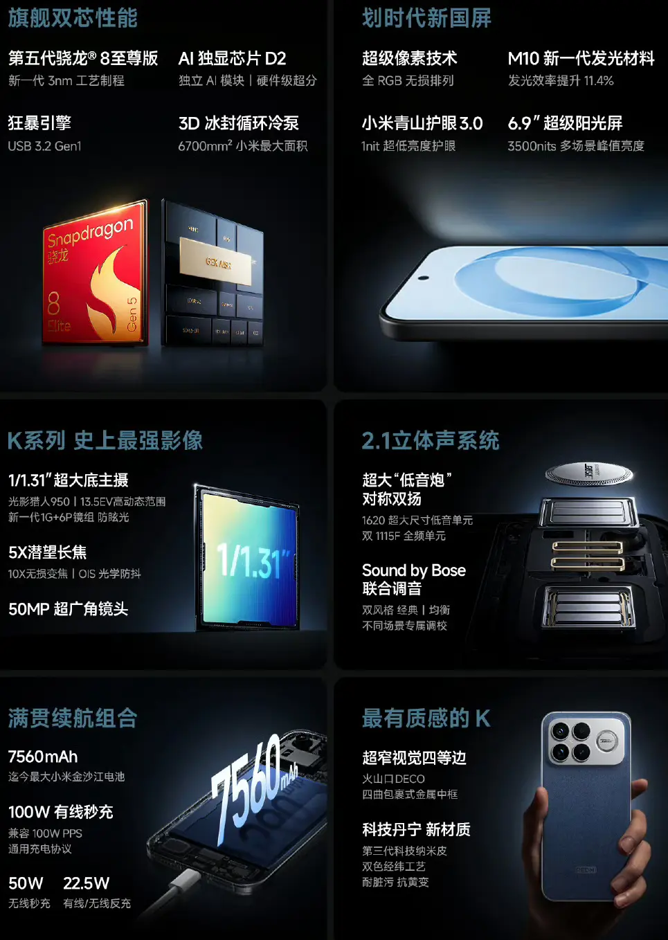 REDMI K90 Pro Maxは、Snapdragon 8 Elite Gen 5搭載の6.9インチ高性能スマホ。BOSE共同開発スピーカーや7560mAhバッテリー、100W充電、防水防塵対応。中国で発売、価格は3999元(約8.6万円)から