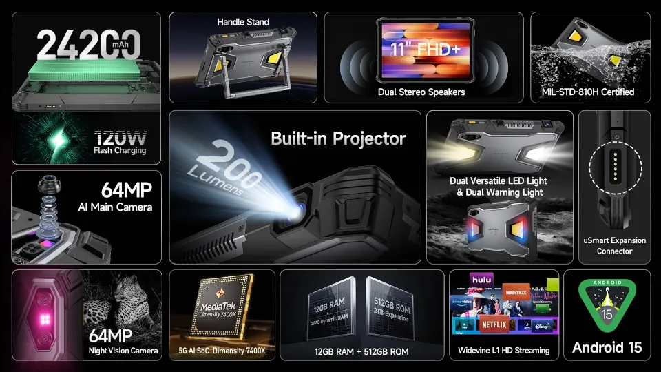 200ルーメンのプロジェクター搭載、防水防塵・耐衝撃対応、大型LEDライト搭載、5G通信対応、120W充電対応24200mAh大容量バッテリー搭載、2K解像度ディスプレイ、拡張に便利なuSmart Expansionなどが特徴のモデルです。OSはAndroid 15、サイドに指紋認証センサー。デュアルステレオスピーカー , イヤホン端子あり、接続端子はUSB Type-Cです。
