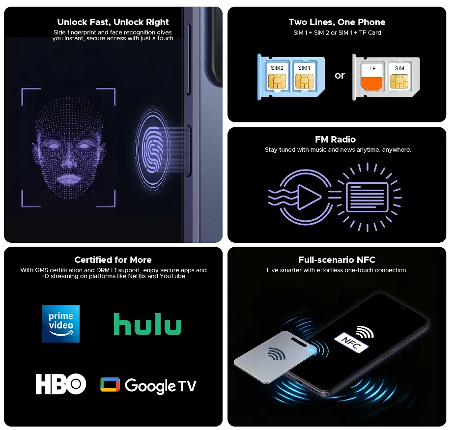 18W充電対応の6150mAhバッテリーやリフレッシュレート90Hzディスプレイなどが特長のモデルです。OSはAndroid 16、指紋認証センサー(サイド)に対応、接続端子はUSB Type-Cです。
