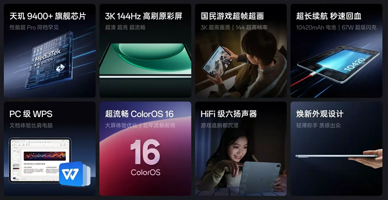 高解像度でリフレッシュレート144HzディスプレイやハイスペックなDimensity 9400+採用、67W充電対応で10420mAhバッテリーなどが特徴です。Android 16 (ColorOS 16)、顔認証対応、接続端子はUSB Type-Cです。2024年7月にグローバルで発売したOnePlus Pad 2とは仕様の異なる別モデル、2025年10月発表のOPPO Pad 5と同じスペックです。
