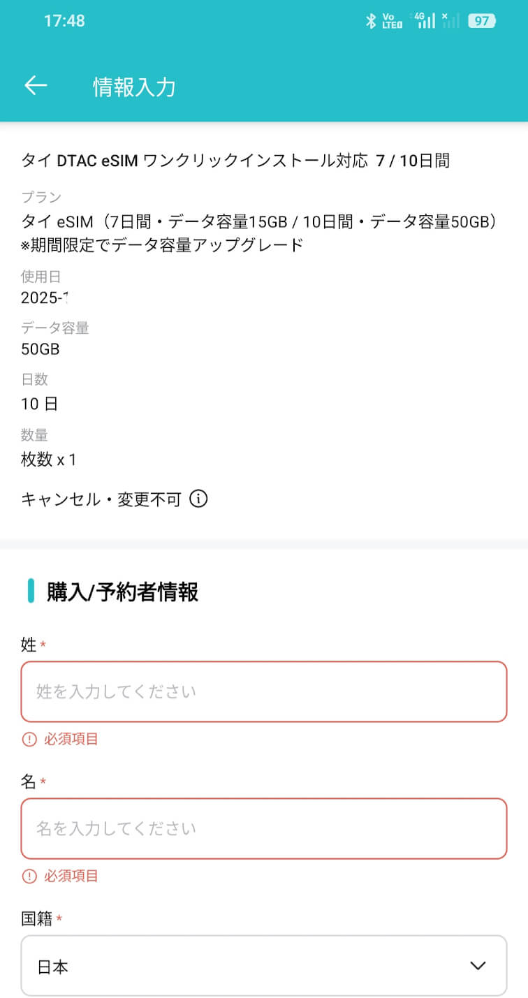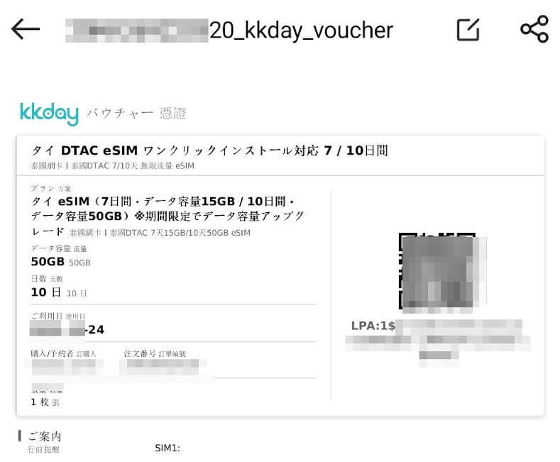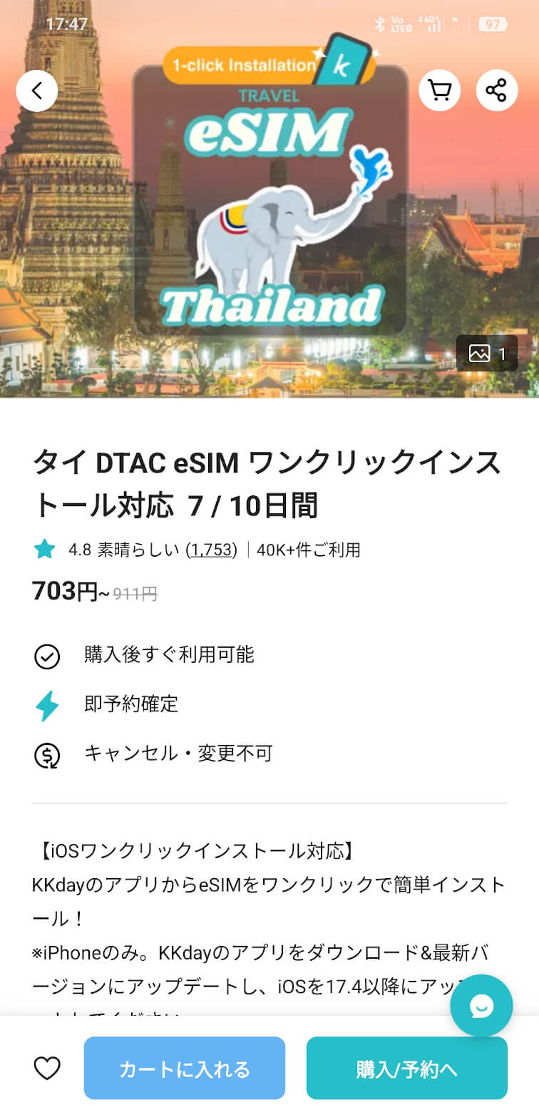 KKdayにタイだけでもeSIMのプランがいくつかありますが、今回はローミングではなく現地SIMと同じように使える「タイ DTAC eSIM ワンクリックインストール対応 7 / 10日間」を購入しました。