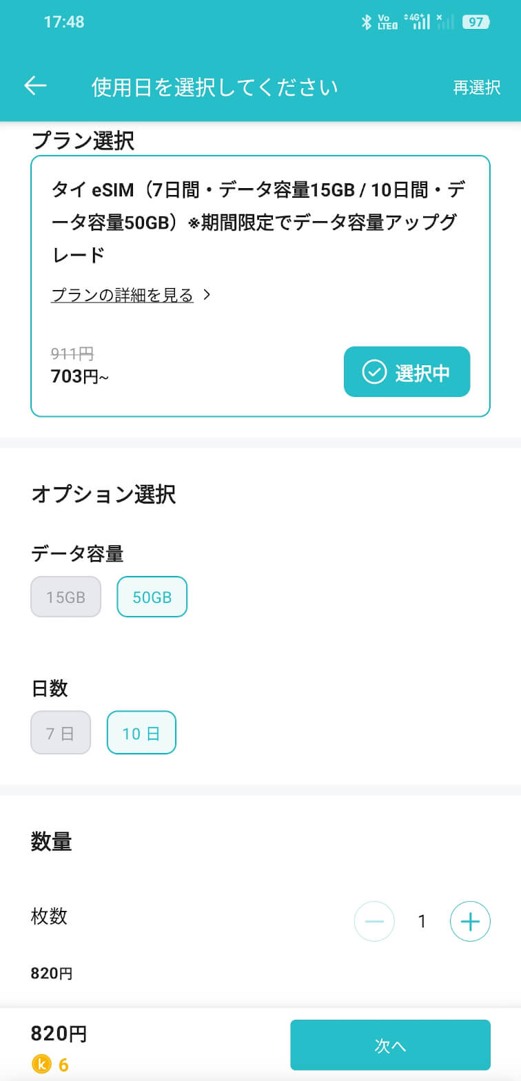7日間で15GBのデータ容量(データ超過後は1Mbpsに速度制限) 703円と10日間で50GBのデータ容量 820円(データ超過後は384kbpsに速度制限)の2つから選ぶことが出来ます。(価格は為替などにより多少変動します)