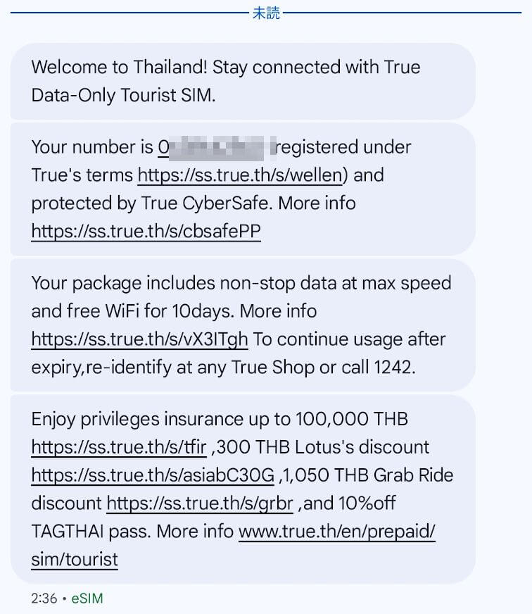 設定が成功するとショートメールが届きます。今回はキャリアDTACで契約しましたがTrueからショートメールが届きました。(現在、DTACとTrueは合併して同じ会社になっています。)