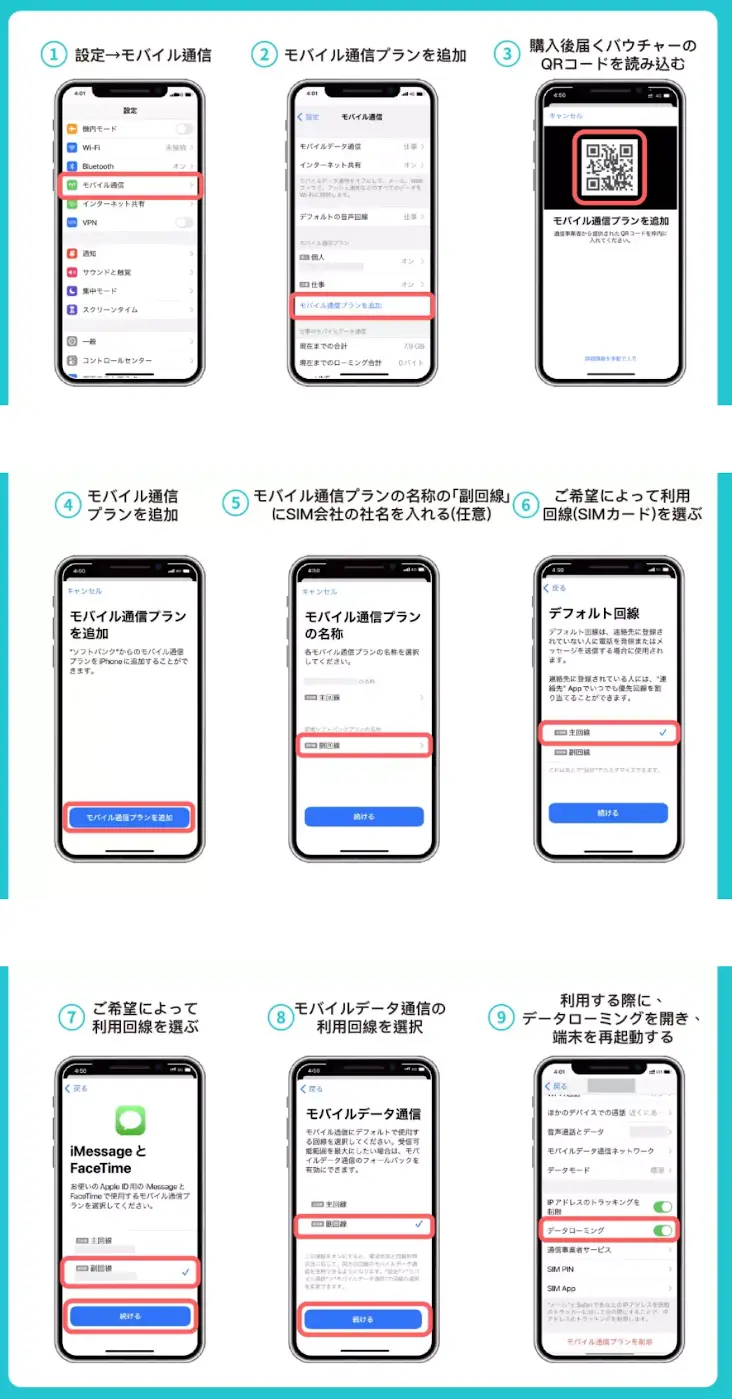 eSIMをオンにして「eSIMを追加」などを選んで画面に指示に従い設定してきます。そしてバウチャーのQRコードを読み込みます。出来ない場合はQRコード下にある文字列「LPA:1$・・・」をコピーして設定するか、パソコンなど他の端末にQRコードを表示させて読み込みます。