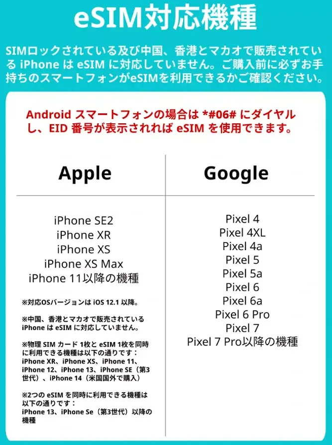 利用にはスマホが上記表の記載されているようにeSIM対応である必要があります。AndroidスマホはPixelのみ記載されていますが、「*#06#」のダイヤル操作で確認可能です。最近のeSIM対応機種であれば、ほとんど問題なく使えると思われます。