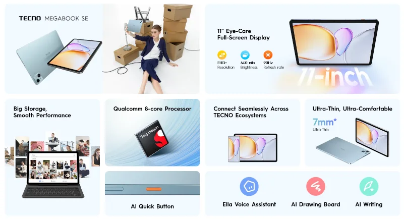 TECNO MEGAPAD SEは、Snapdragon搭載の11インチAndroidタブレット。90Hzディスプレイや8000mAhバッテリー、Dolby Atmos対応スピーカーを備えたモデル。海外で発売。