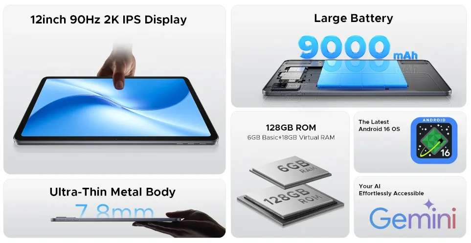 DOOGEE U12は、UNISOC T616搭載の12インチAndroidタブレット。2K解像度90Hzディスプレイや9000mAhバッテリー、デュアルスピーカー。2025年10月に発売