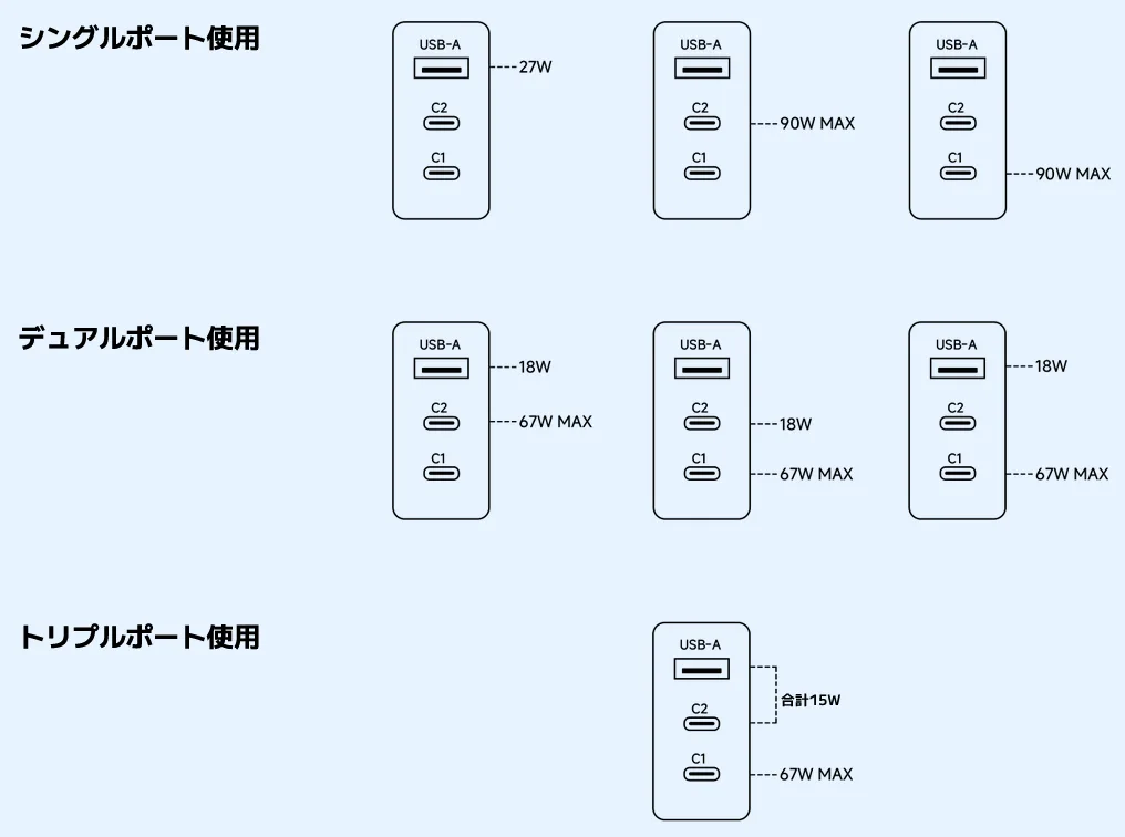 シングルポート出力:USB C1/C2:5.0V⎓ 3.0A 15.0W、9.0V⎓ 3.0A 27.0W、15.0V⎓ 3.0A 45.0W、11.0V⎓ 6.1A 67.0W(最大)、20.0V⎓ 4.5A 90.0W(最大) USB A:5.0V⎓ 3.0A 15.0W、9.0V⎓ 3.0A 27.0W、12.0V⎓ 2.25A 27.0W