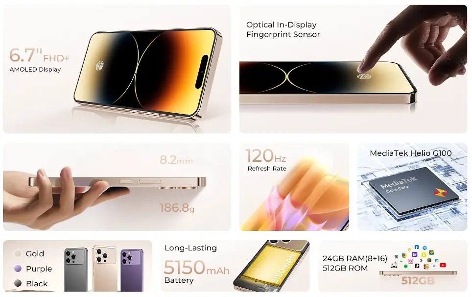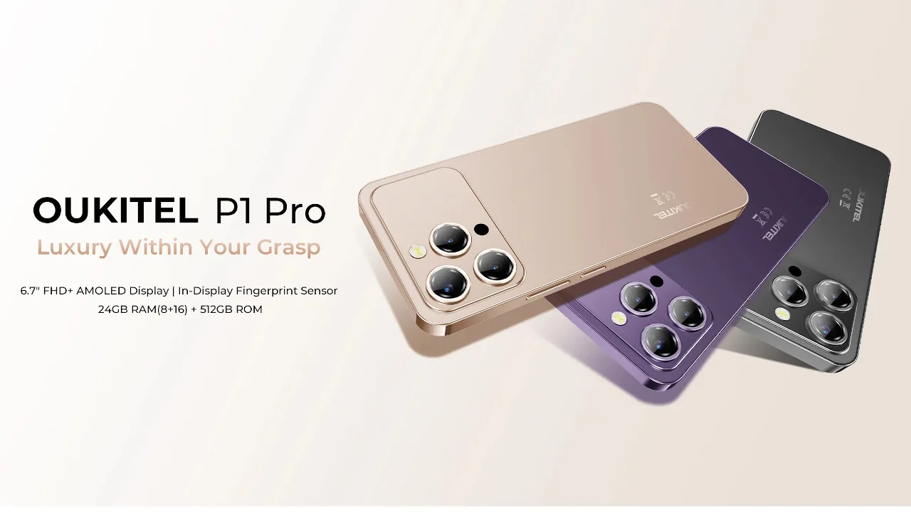 OUKITEL P1 Pro は、6.7インチFHD+(240812×1080)ディスプレイ、CPUはMediaTek Helio G100 2.2GHz オクタコア、RAM4GB/8GB、ストレージ容量は256GB/512GB、カメラは5000万画素+200万画素+30万画素トリプルカメラ搭載のミッドレンジクラスのアンドロイドスマートフォンです。