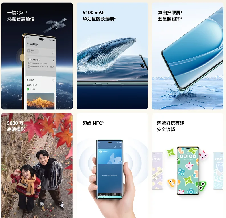 40W急速充電対応6100mAhバッテリーや高解像度な曲面有機ELディスプレイ、OSにHuawei(ファーウェイ)独自の「HarmonyOS 4.2」採用などが特長のモデルです。衛星通信対応、接続端子はUSB Type-C、生体認証は指紋認証センサー(画面内)と顔認証に対応しています。Google関連のアプリやPlayストアは利用できません。