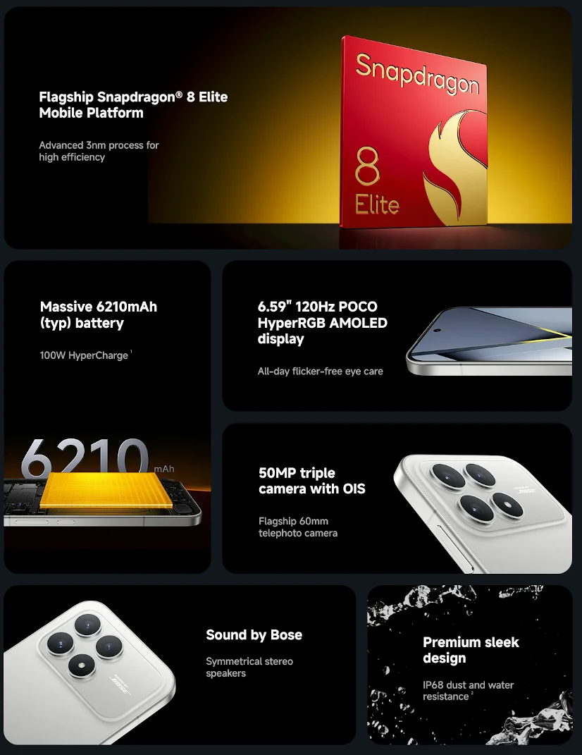 Xiaomi POCO F8 Proは、Snapdragon 8 Elite搭載の6.59インチハイスペックAndroidスマホ。120Hz AMOLEDディスプレイやBOSE監修スピーカー、6210mAhバッテリー・100W急速充電、防水防塵対応。海外で発売、価格は2599元(約5.6万円)から。