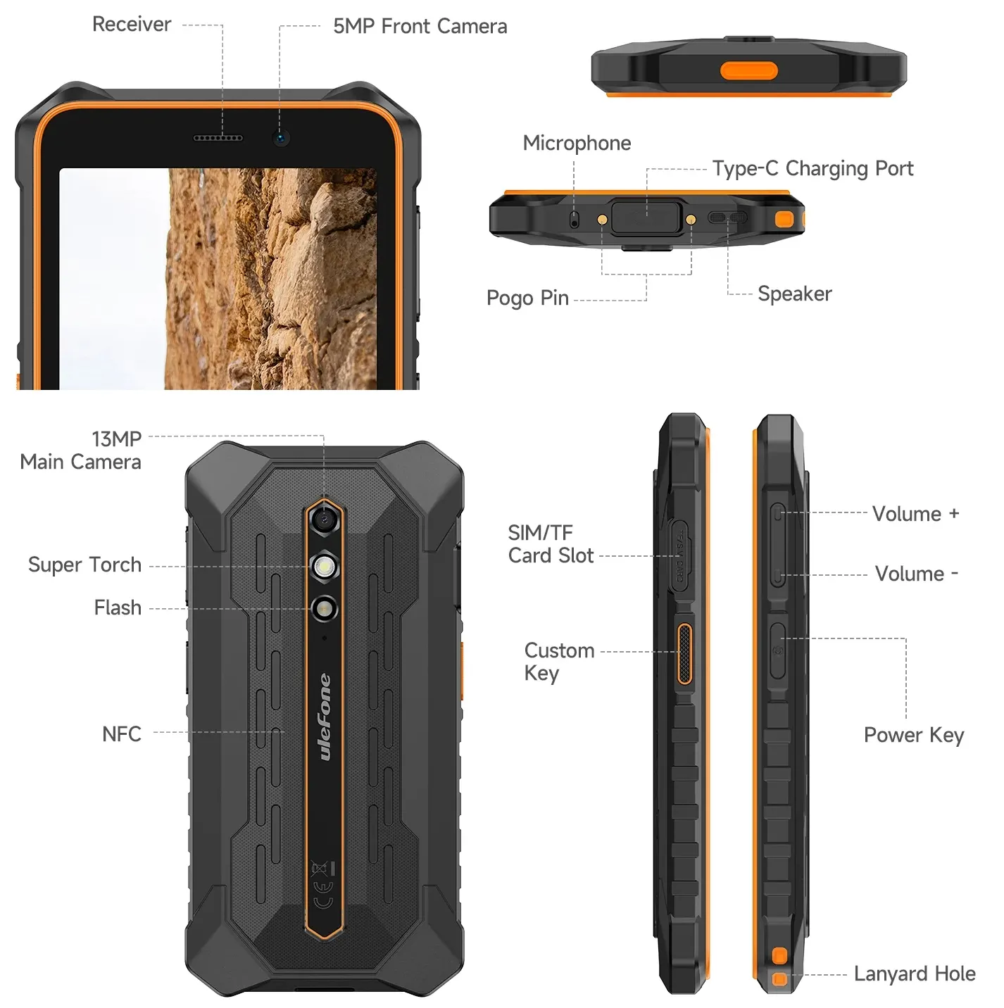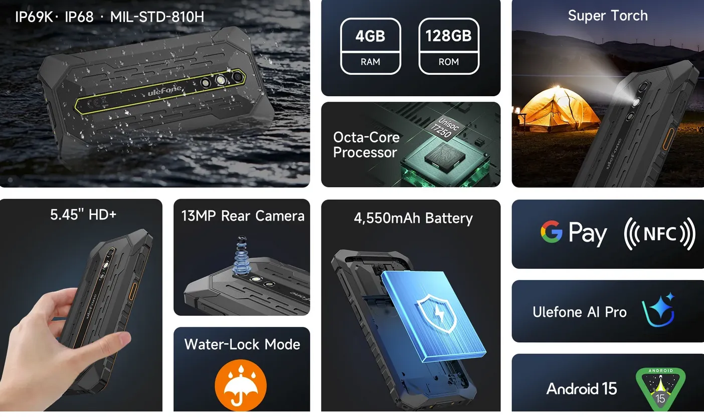 Ulefone RugKing 2 Pro は、5.45インチHD+(1440×720)ディスプレイ、CPUはUNISOC T615 (T7250) 1.8Ghz オクタコア、RAM4GB、ストレージ容量は128GB、カメラは1300万画素カメラ搭載のエントリークラスのアンドロイドスマートフォンです。