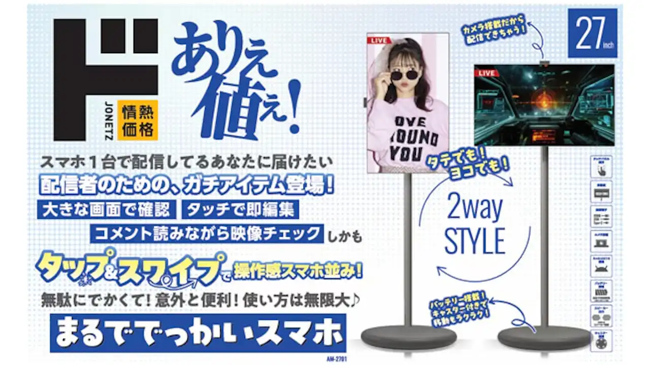 ドン・キホーテは、ドンキのプライベートブランドである「情熱価格」の新商品、Androidの27インチ移動型スマートモニター「まるででっかいスマホ (AM-2701)」を発表しました。