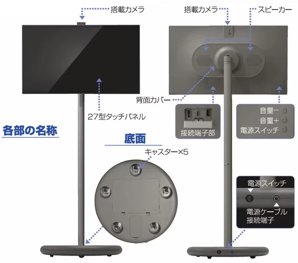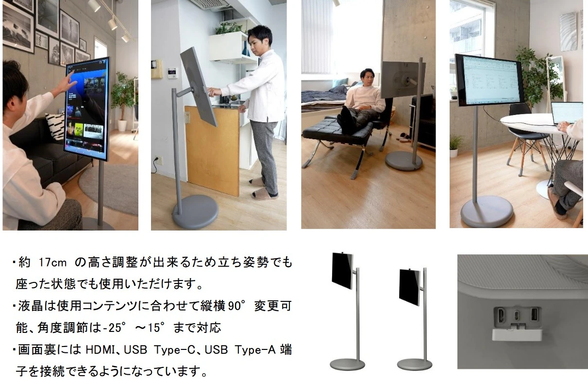 タッチ操作可能な27インチモニターはAndroid OSによりタブレットのような操作が可能、台座は充電式バッテリーとキャスターを備え17センチの高さ調整、モニターは縦横 90°変更と角度調節‐25°~15°できます。画面裏にはHDMI端子・USB Type-C・USB Type-Aがあります。