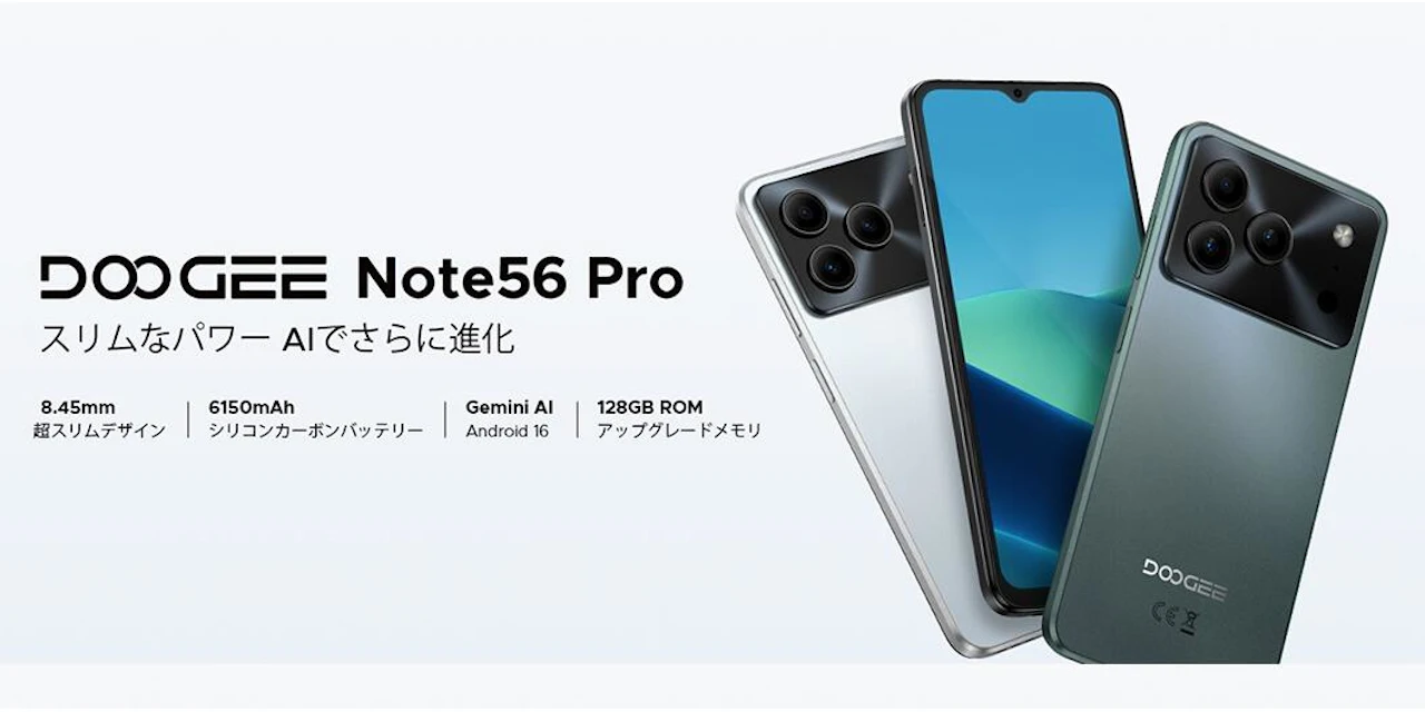 中華スマホメーカーのDoogeeは、6.56インチディスプレイ4Gスマートフォン「DOOGEE Note56 Pro」を発表しました。