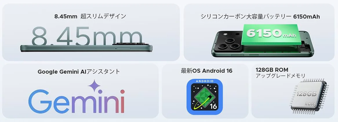 6150mAhバッテリーやリフレッシュレート90Hzディスプレイなどが特長のモデルです。OSはAndroid 16、指紋認証センサー(サイド)に対応、接続端子はUSB Type-Cです。