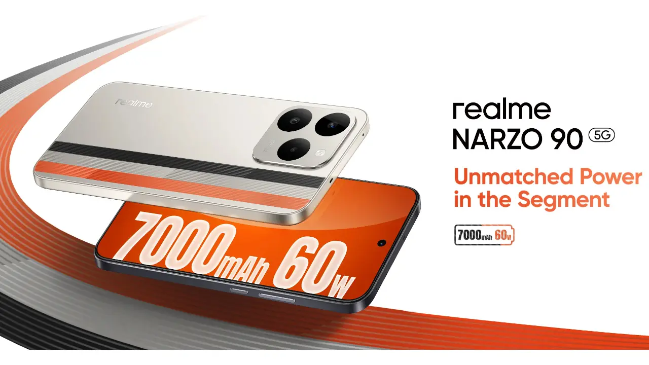 realme NARZO 90 5Gは、Dimensity 6400 MAX搭載の5Gスマホ。120Hz AMOLEDディスプレイや7000mAh大容量バッテリー、60W急速充電、防水防塵対応。インドで発売、価格は16,999INR(約2.9万円)から。