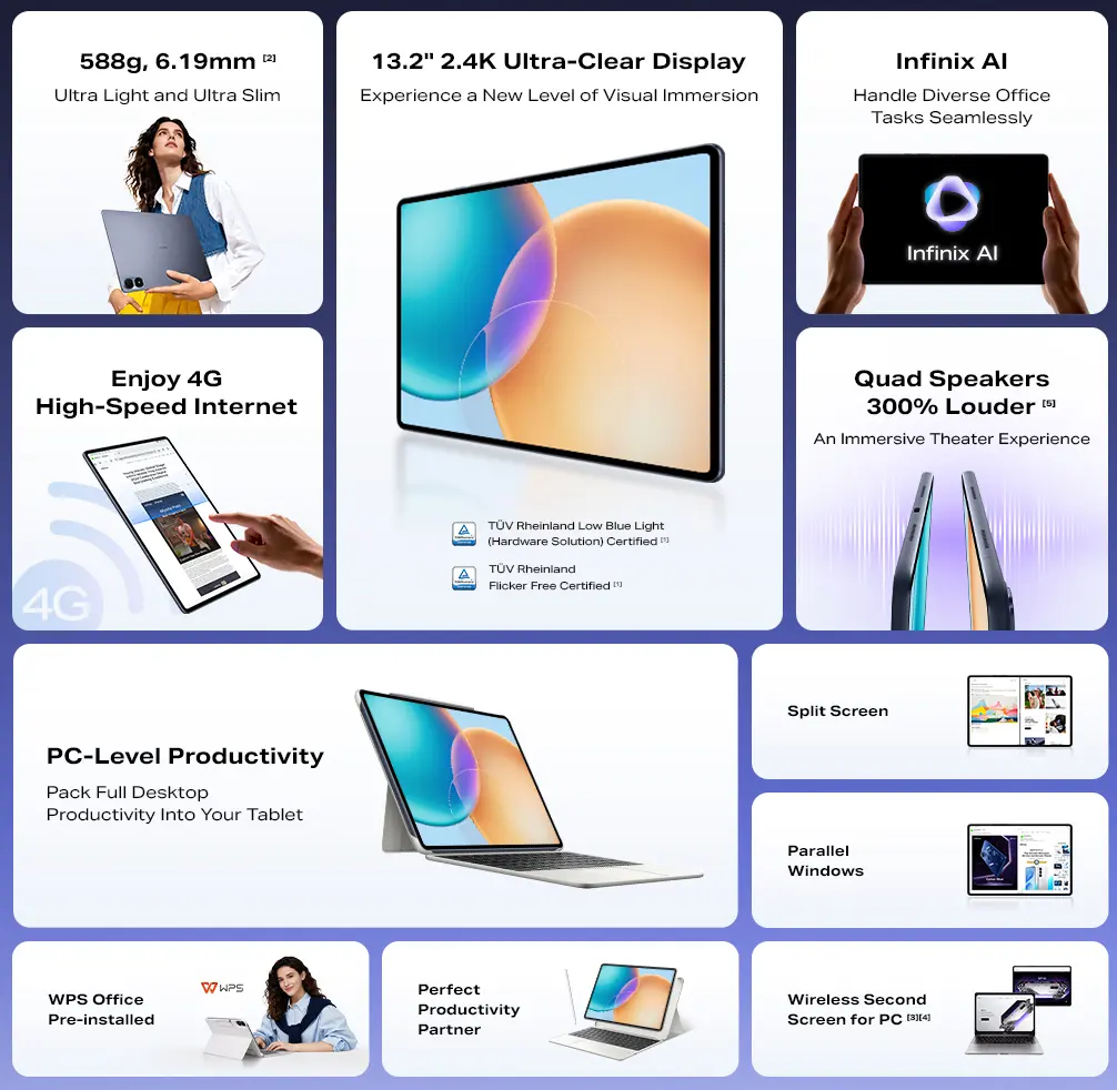Infinix XPAD Edge は、13.2インチ(2400×1600) ディスプレイを搭載し、CPUはSnapdragon 685 4G 2.6GHz オクタコア、RAM4GB/8GB、ストレージ容量は128GB/256GB、メインカメラ800万画素カメラ搭載のミッドレンジクラスのアンドロイドタブレットです。
