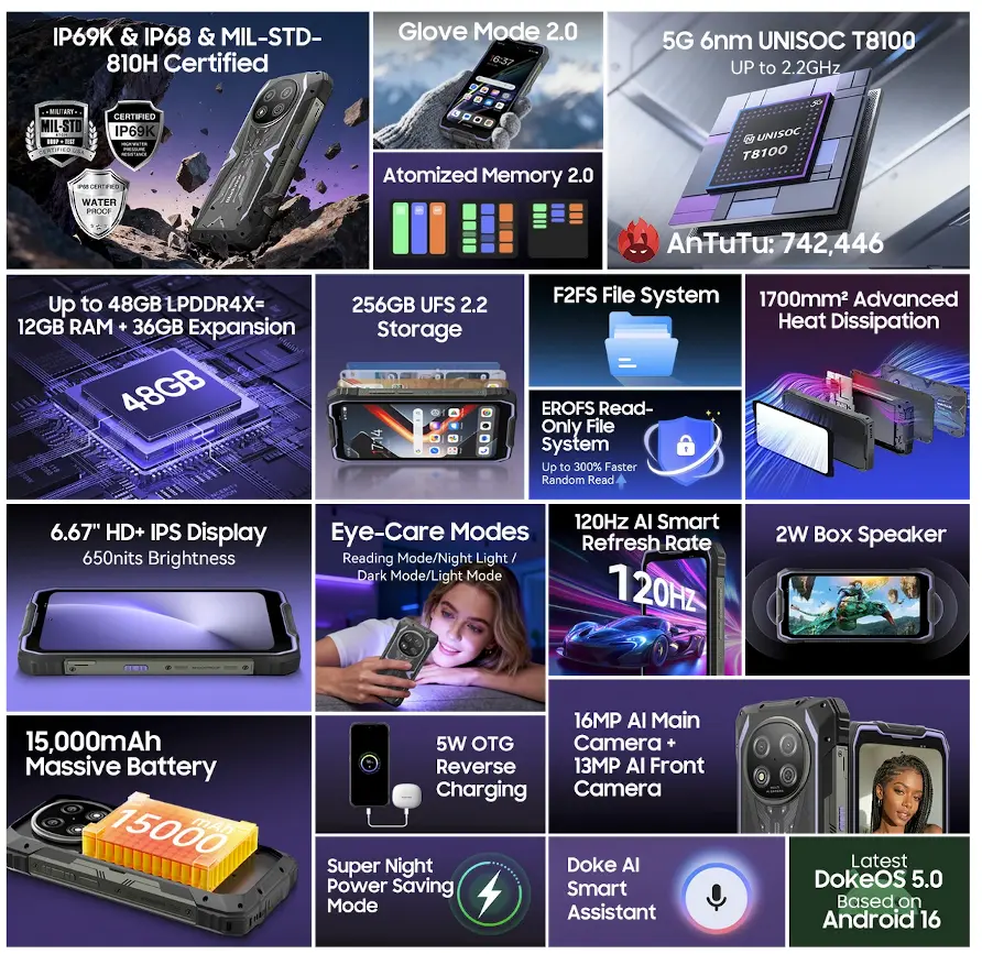 Blackview ROCK 2 は、15000mAh大容量バッテリーを搭載した5G対応タフネスAndroidスマートフォン。UNISOC T8100や120Hzディスプレイ、防水防塵・耐衝撃に対応。海外で発売予定。