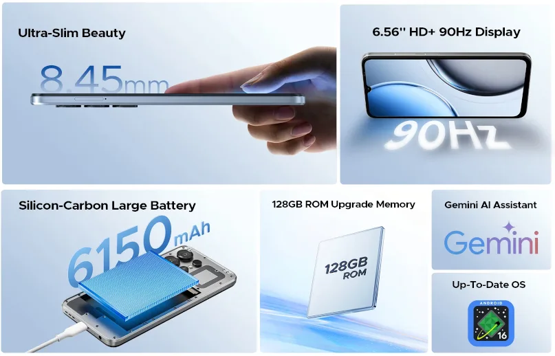 6150mAhバッテリーやリフレッシュレート90Hzディスプレイなどが特長のモデルです。OSはAndroid 16、指紋認証センサー(サイド)に対応、接続端子はUSB Type-Cです。