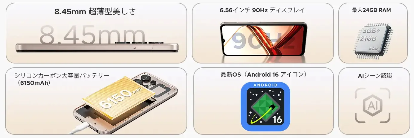 6150mAhバッテリーやリフレッシュレート90Hzディスプレイなどが特長のモデルです。OSはAndroid 16、接続端子はUSB Type-Cです。