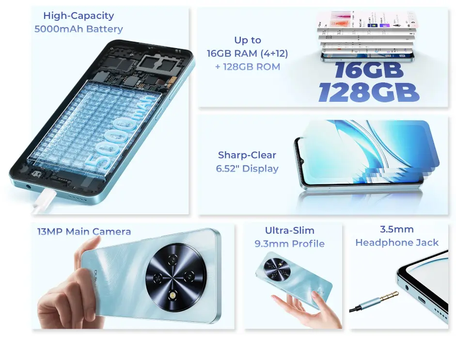 OUKITEL C5 は、6.52インチHD+(1200×540)のディスプレイ、CPUにUNISOC Tiger T310 2.0GHz クアッドコア、RAM4GB、ストレージ容量は64GB/128GB/256GB、メインカメラは1300万画素カメラ搭載のローエンドクラスのアンドロイドスマートフォンとなっています。