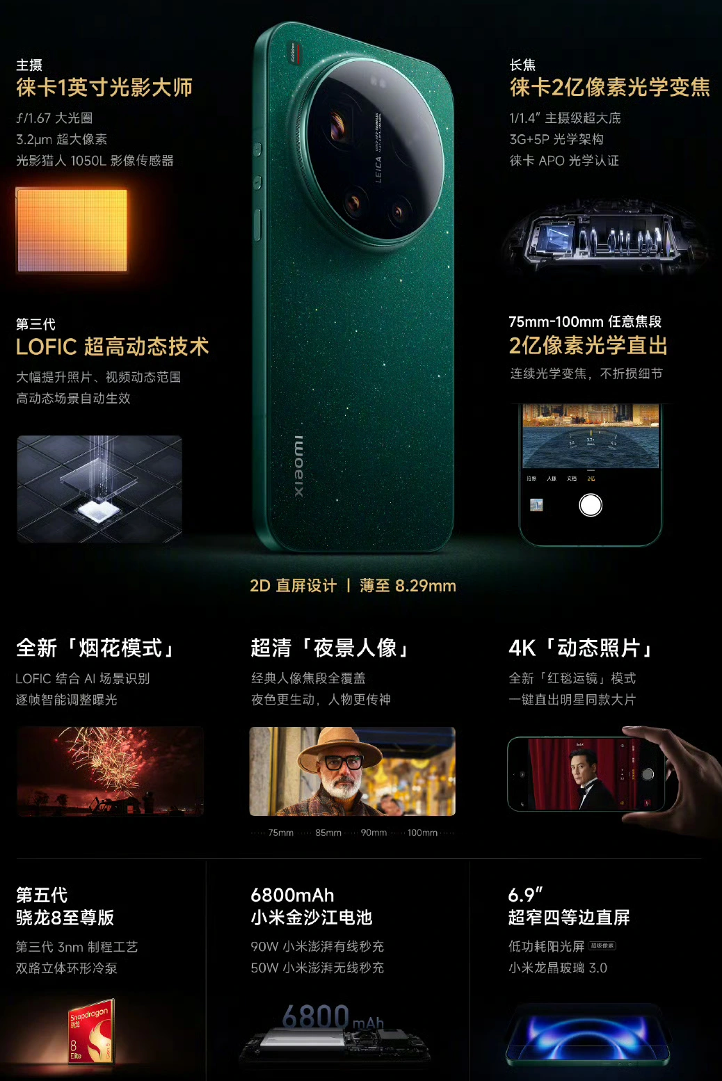 Xiaomi 17 Ultra は、Snapdragon 8 Elite Gen 5 や1インチセンサーのメイン+2億画素APOズームのLeica監修カメラ、6.9インチ120Hz AMOLED、90W急速充電対応6800mAhバッテリー、防水防塵を備えるカメラ特化フラッグシップモデルです。中国で発売、価格は6999元(約15.6万円)から