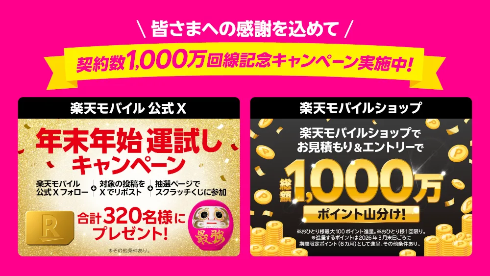 楽天モバイル株式会社は、2025年12月25日に契約数が1,000万回線を突破したと発表しました。突破を記念してスペシャルキャンペーンも実施します。