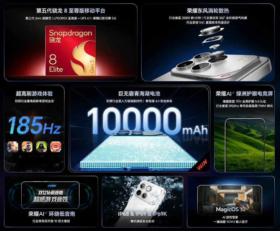 HONOR WIN は、10000mAhバッテリーとSnapdragon 8 Elite Gen 5を搭載したハイスペックAndroidスマートフォン。6.83インチAMOLED 186Hzディスプレイ、OIS対応50MPトリプルカメラ、100W急速充電・ワイヤレス充電、空冷、防水防塵対応。中国で発売、価格は3999CNY(約9.0万円)から。