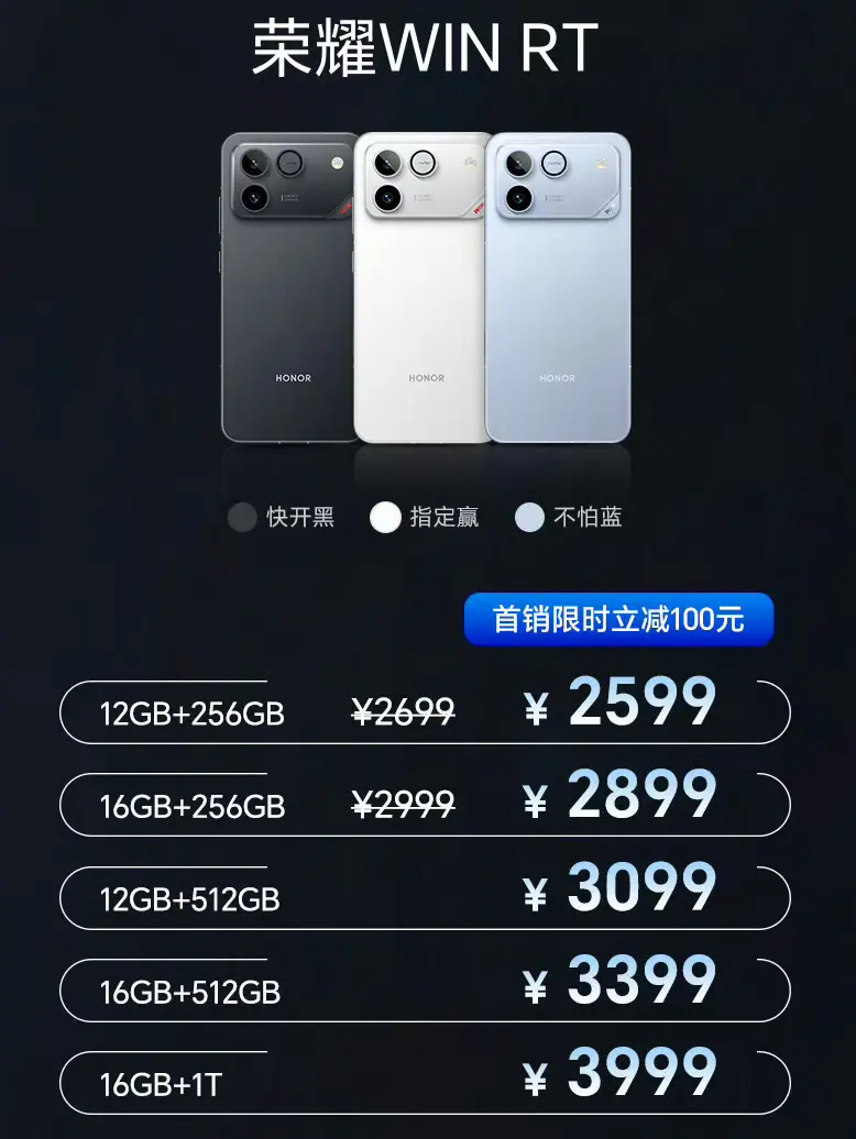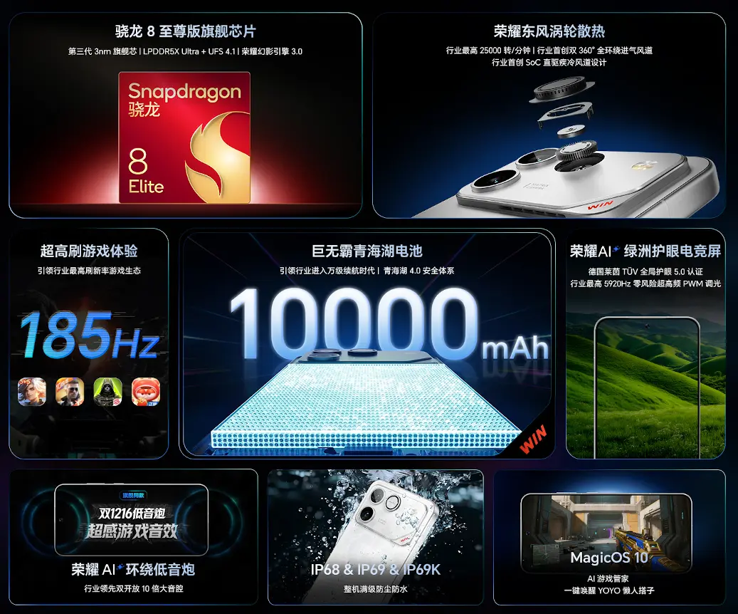 HONOR WIN RT(荣耀WIN RT) は、Snapdragon 8 Eliteと1万mAhバッテリー、185Hz AMOLED、50MPデュアルカメラ、防水防塵、100W充電対応のハイスペックAndroidスマートフォン。中国で2025年12月発売。価格は2599CNY(約6万円)〜