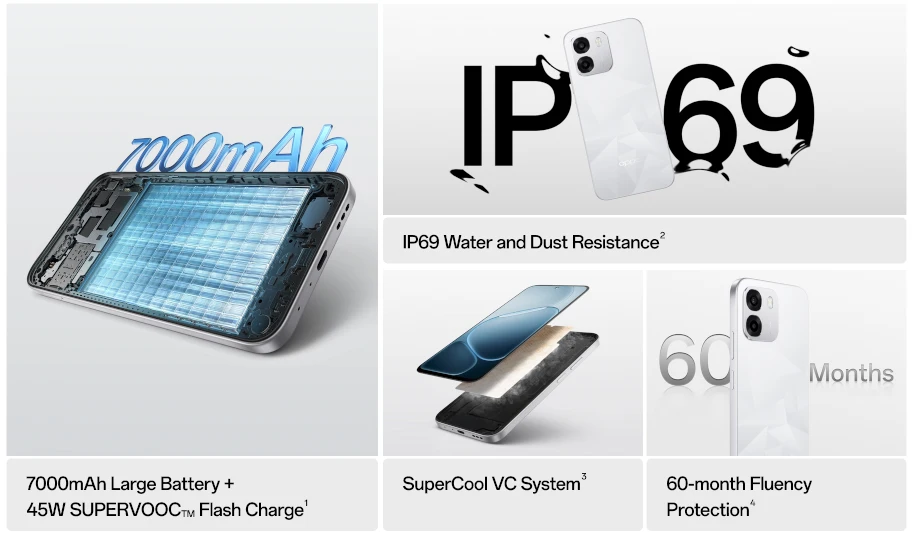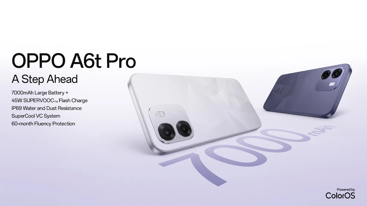 OPPO A6t Pro (CPH2849) は、Snapdragon 685 と6.75インチ120Hzディスプレイ、IP69防水防塵、45W充電対応大容量7000mAhバッテリー搭載の4Gスマートフォン。海外で発売。