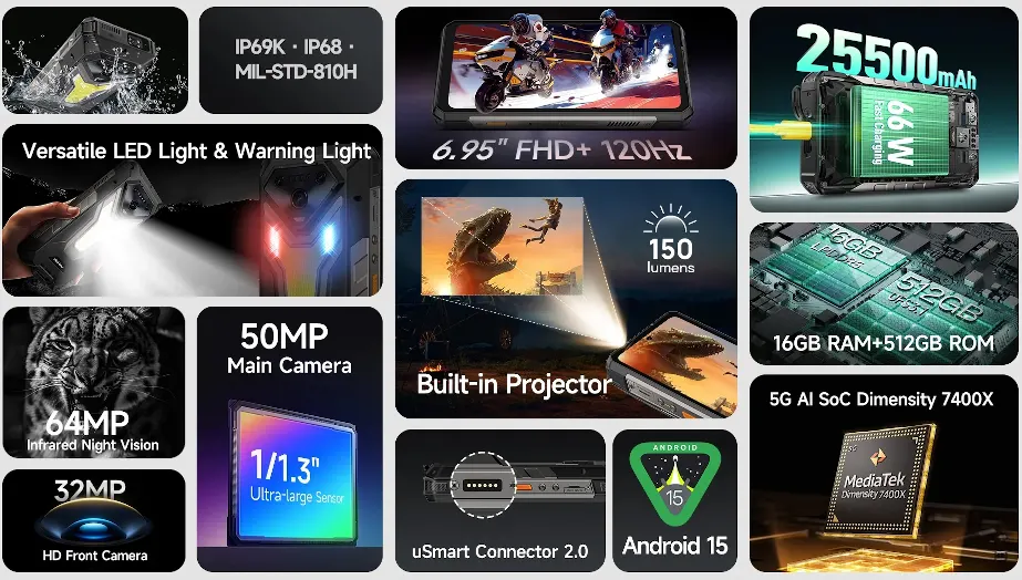防水防塵・耐衝撃対応(IP68/IP69K,MIL-STD-810H)対応、Night Visionカメラ、66W充電対応25500mAh大容量バッテリー、上部に150ルーメンのプロジェクター搭載、冷却ファン、リフレッシュレート120Hzディスプレイが特長です。生体認証は指紋認証センサー(サイド)と顔認証に対応、OSはAndroid 15、イヤホン端子はあり、接続端子はUSB Type-Cです。