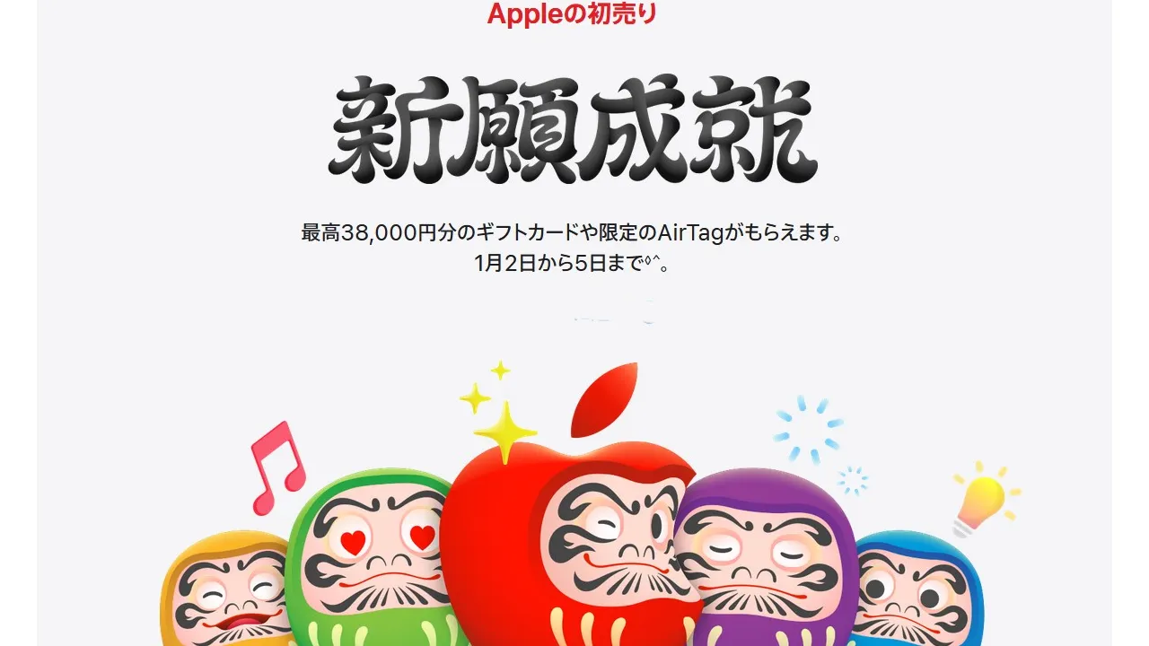 Apple(アップル)は、最高38,000円分のApple Gift Cardなどがもらえるキャンペーン「Appleの初売り」を2026年1月2日から5日まで開催します。