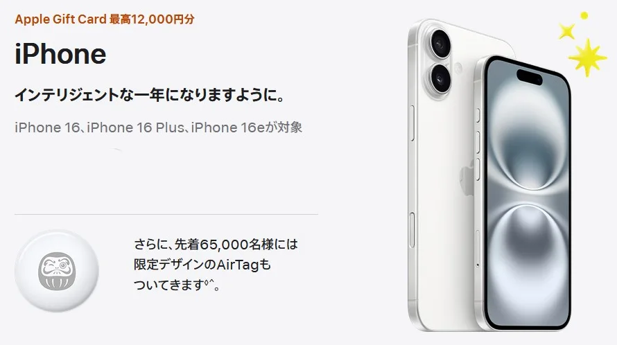 対象商品購入でApple Gift Cardをプレゼント、対象のiPhone(iPhone 16、iPhone 16 Plus、iPhone 16e)を購入でスペシャルエディションのAirTagを限定6万5,000 個でプレゼント