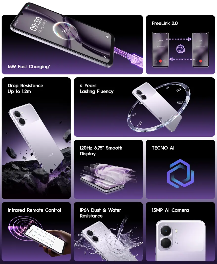 TECNO SPARK Go 3 は、UNISOC T7250を搭載したエントリー向けAndroidスマートフォンで、6.75インチ120Hzディスプレイ、5000mAhバッテリー、防水防塵に対応したエントリーモデル。海外で発売。