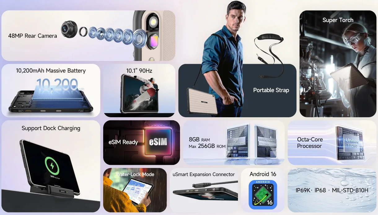 防水防塵・耐衝撃対応、eSIM対応、10200mAhmAhバッテリー搭載、拡張に便利なuSmart Expansionなどが特徴のモデルです。OSはAndroid 16、サイドに指紋認証センサー。デュアルステレオスピーカー , イヤホン端子あり、接続端子はUSB Type-Cです。