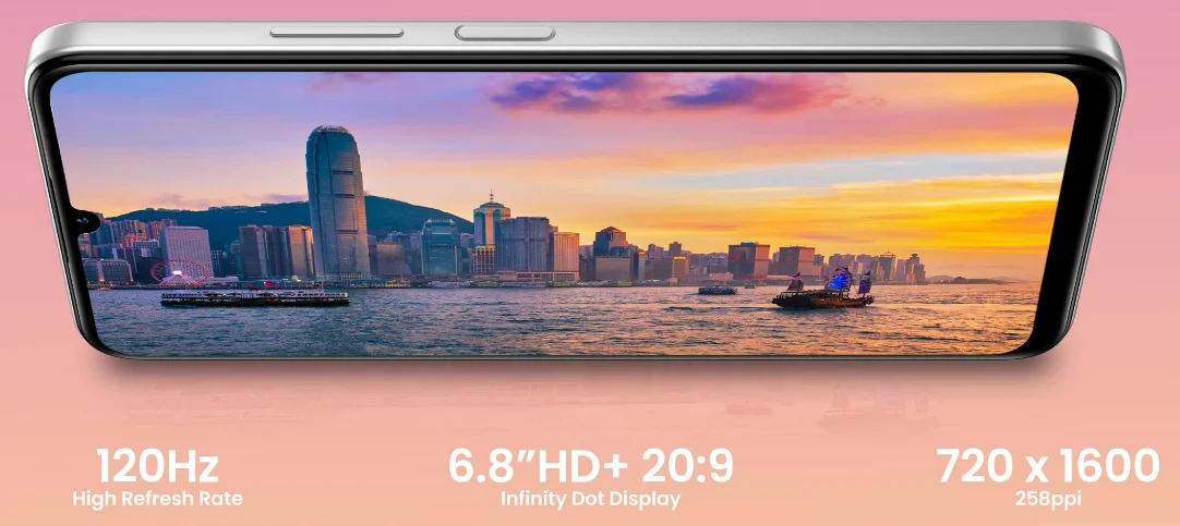 ディスプレイ : 6.8インチ HD+ 1600×720 20:9 120Hz