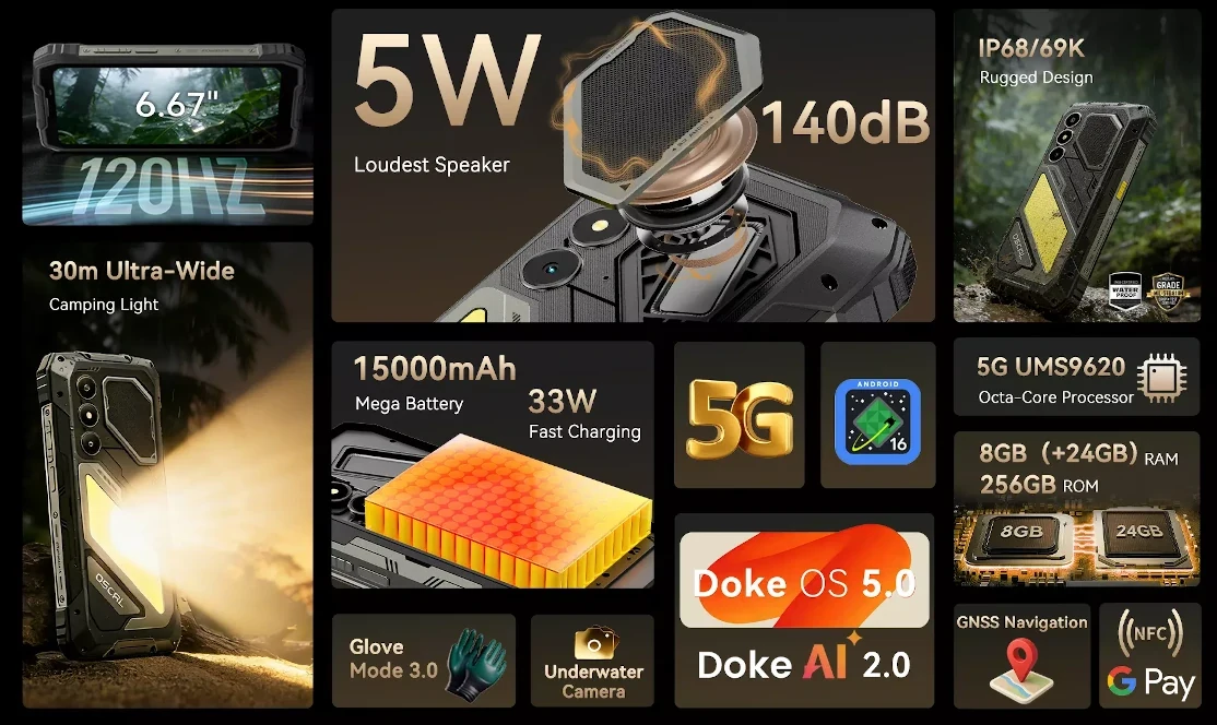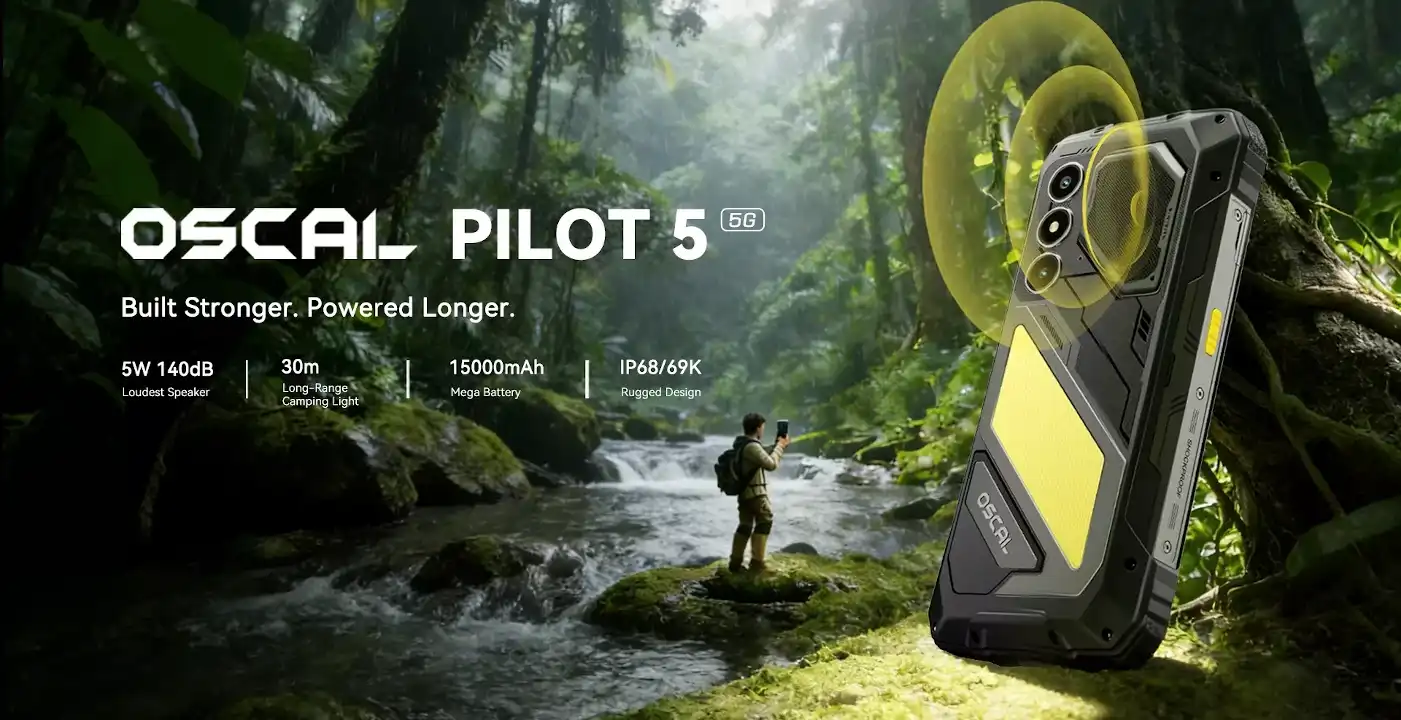 Blackview OSCAL PILOT 5 は、UNISOC T8100搭載の5G対応タフネスAndroidスマートフォンで、IP68/IP69K準拠の耐久性能や15000mAh大容量バッテリー、大音量スピーカー、120Hzディスプレイ、Android 16を採用した堅牢モデルです。
