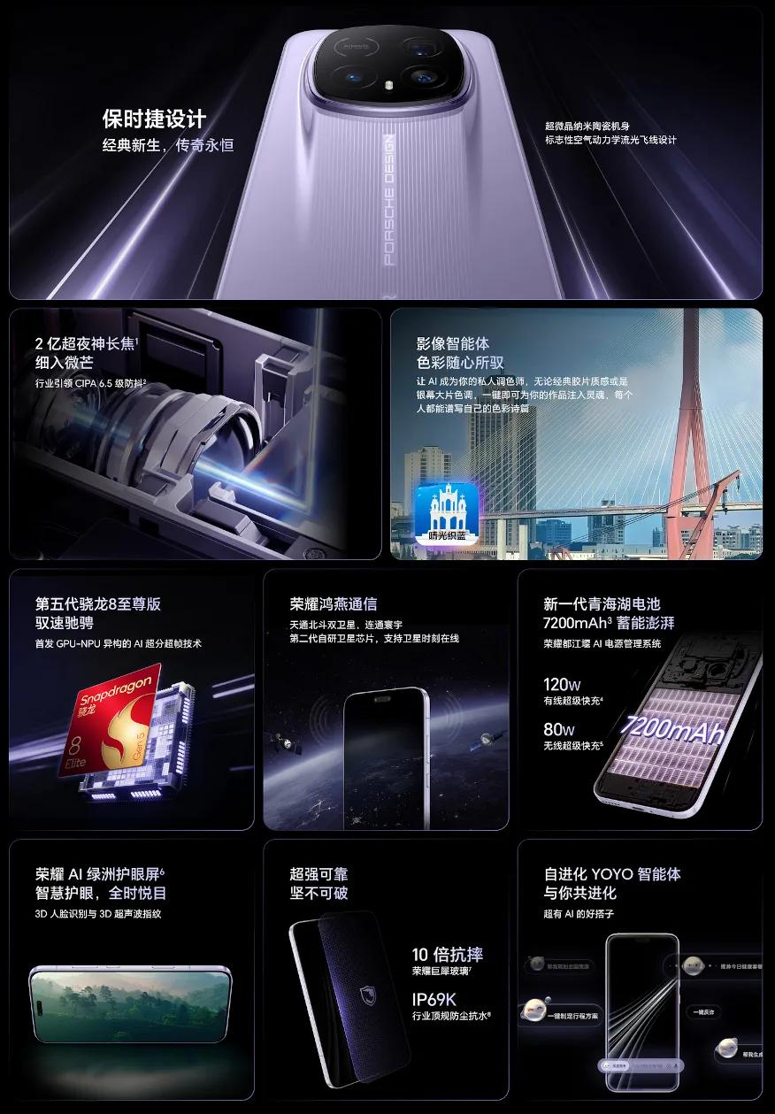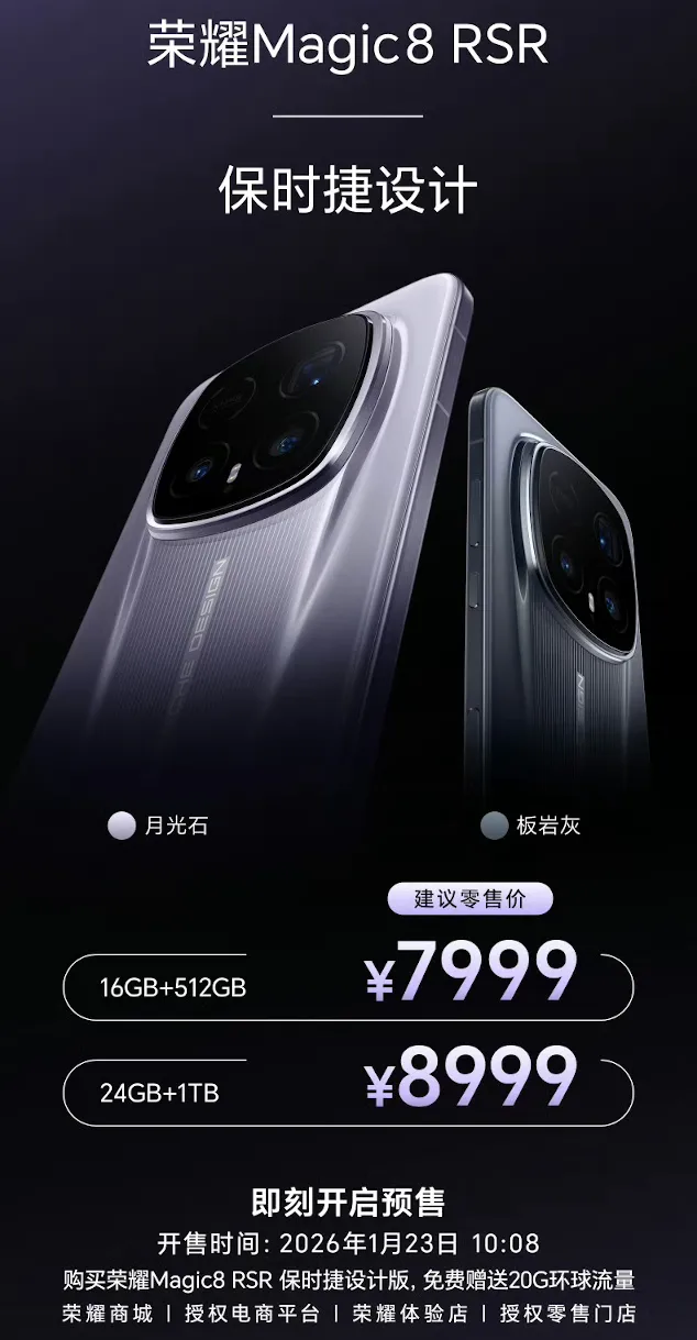 HONOR Magic8 RSR は、ポルシェデザイン採用のフラッグシップモデルで、2億画素望遠カメラや7200mAh大容量バッテリー、衛星通信対応が特長です。2026年1月に中国で発売、価格は7999CNY(約18.2万円)から。