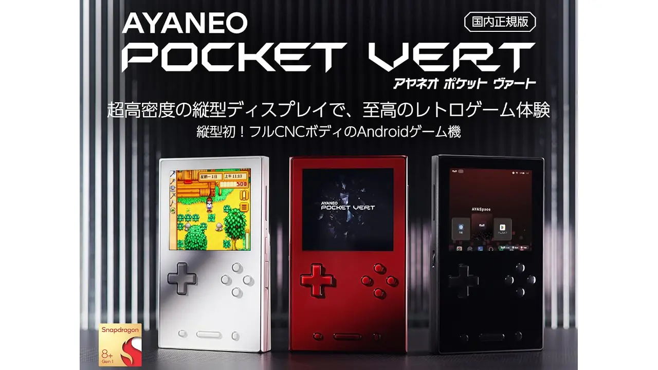 AYANEO POCKET VERT(アヤネオポケット ヴァート)は、Snapdragon 8+ Gen 1を搭載した縦型デザインの高性能Androidゲーム機で、3.5インチ高解像度ディスプレイやフルメタルボディ、物理ボタンを備え、レトロゲームやエミュレータ用途に適した国内向けモデルです。2026年2月20日に発売予定、価格は79,800円(先行予約で76,800円)。