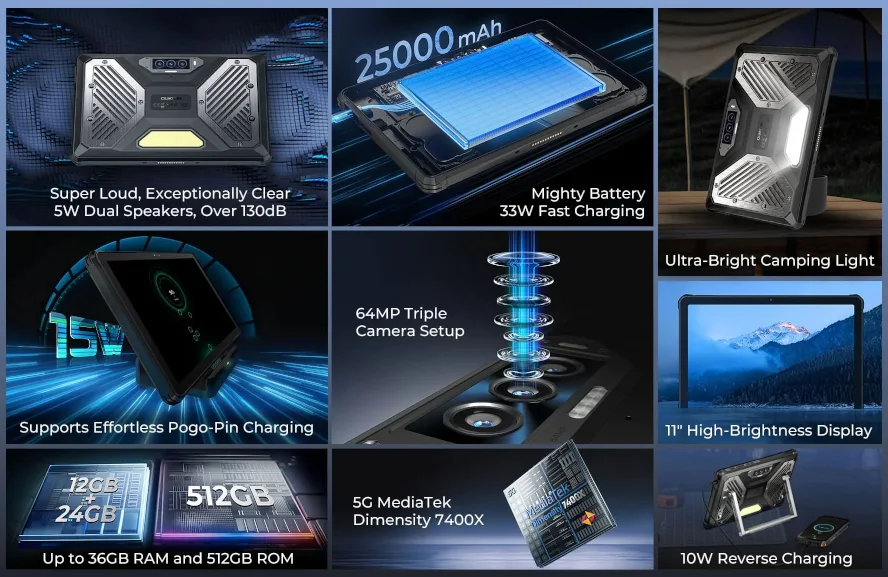 OUKITEL RT10 は、25000mAhの超大容量バッテリーと防水防塵・耐衝撃対応を備えた11インチの5G対応タフネスAndroidタブレットで、Dimensity 7400Xや64MPトリプルカメラを搭載するモデルです。海外で発売。