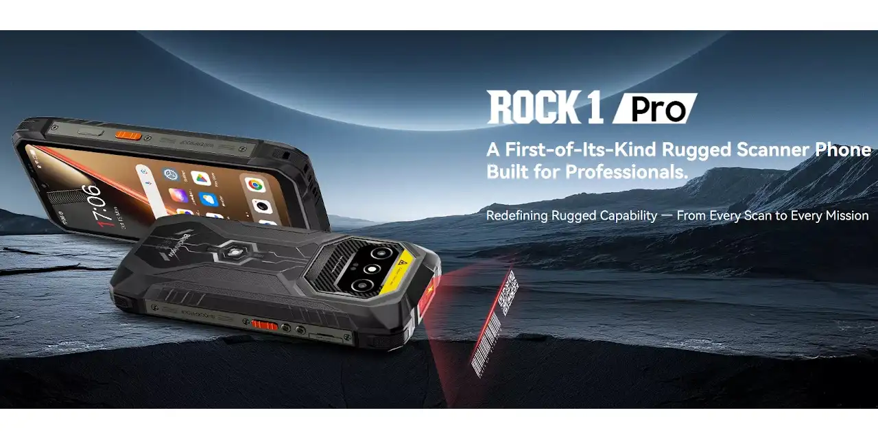 Blackview ROCK 1 Pro は、バーコードリーダーと15000mAh大容量バッテリーを備えたタフネス仕様のAndroidスマートフォンです。6.56インチディスプレイ、Helio G81、1600万画素+2000万画素(ナイトビジョン)のデュアルカメラ、IP68/IP69KやMIL-STD-810H準拠の防水防塵・耐衝撃性能。海外で発売。